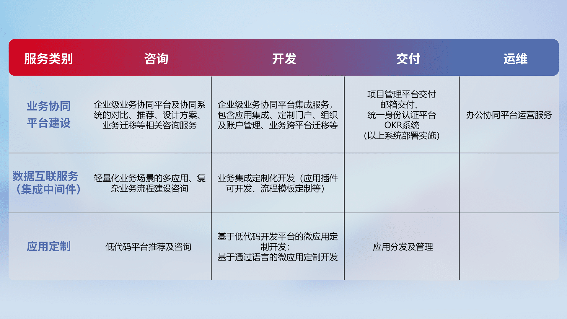针对钉钉、、、、企微、、、IDaas等平台级产品提供产品的规划、、、方案、、、、交付、、定制化开发等服务,,,实现如统一协同办公、、、智能客户服务、、、混合会议管理、、、智能数据查询、、、、等业务场景,,实现数字化转型。。