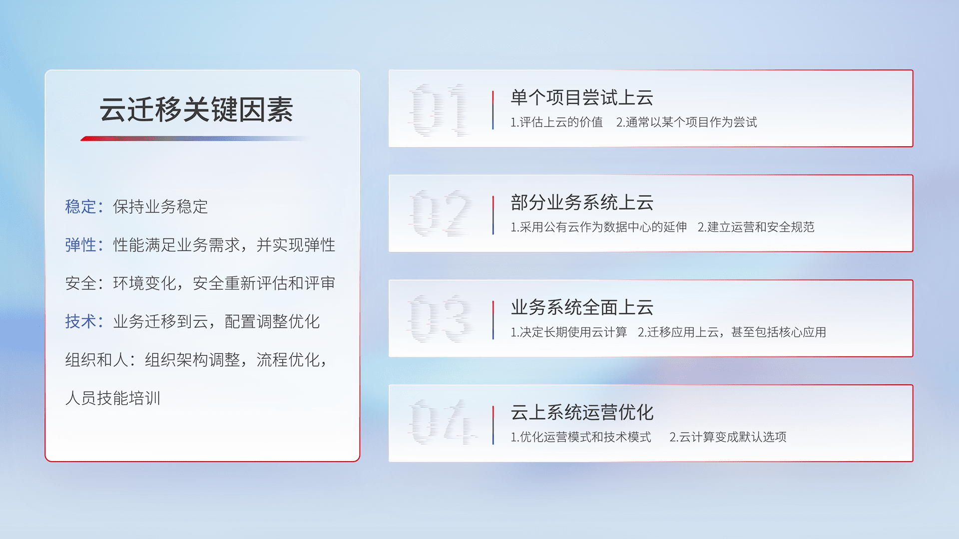 结合实际业务,,从规划设计、、云平台选型、、、、云原生改造、、数据迁移、、、集成交付,,,,迁移全过程为客户识别最佳上云路径,,,,做好风险识别管理,,设计网络架构、、身份权限、、、安全审计合规、、、、操作审计、、、、日志审计、、监控告警策略、、多站点容灾设计等,,对云上基础设施进行整体规划,,提升IT治理水平,,以满足弹性、、、、高可用、、高性能的需求。。。