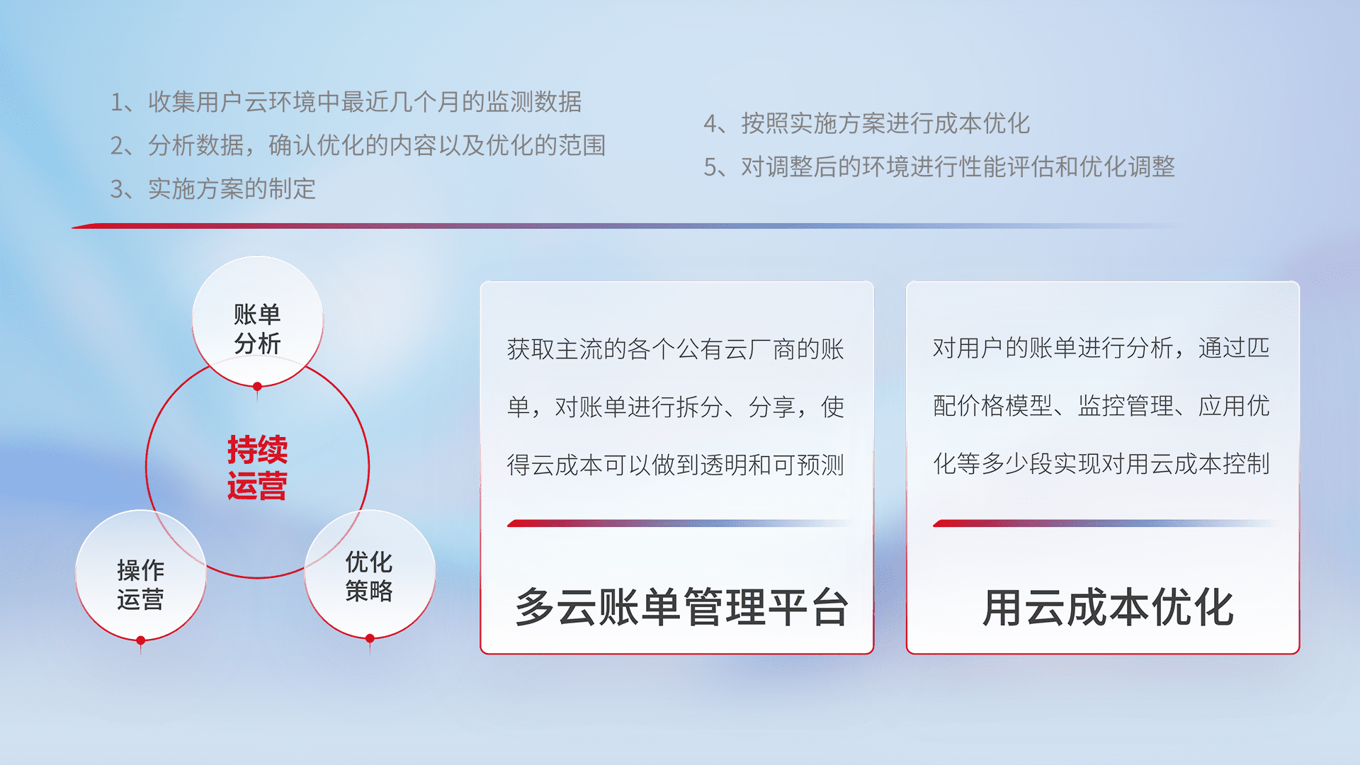 通过多云纳管,,以统一的资源数据模型把客户的云资源进行抽象和封装,,进而实现对多云资源的统一操作,,保障云资源管理的可靠性、、稳定性与可用性。。量身定制化运维内容,,配置、、开发运维、、、补丁管理、、、、备份、、、、监控、、、认证和访问管理、、、审计和日常巡检等,,保障在用云过程中的可靠度,,,稳定度以及高可用率。。。